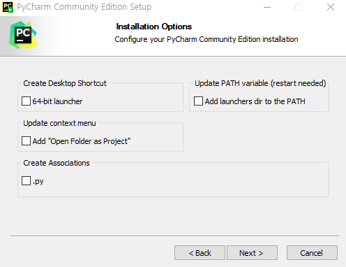 가장 아래 체크 박스를 선택하면 .py 파일을 모두 파이참으로 연동한다고 합니다.