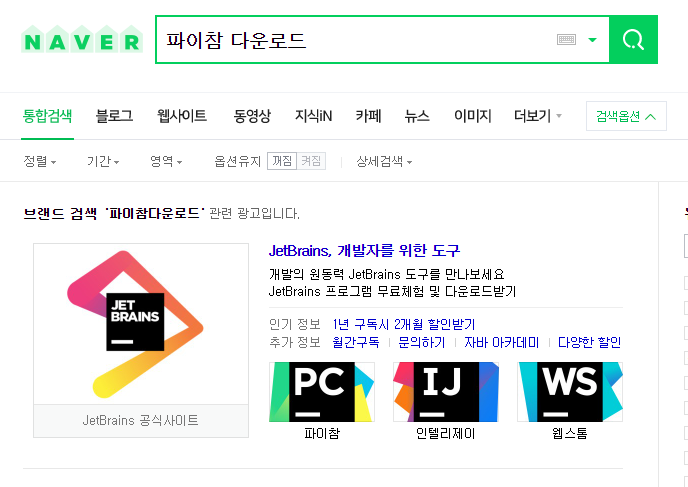 1.네이버에서 파이참 다운로드 검색