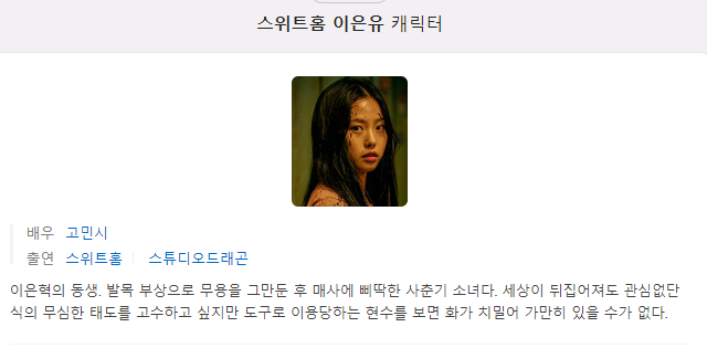 사람들 평가를 보니 원작 웹툰 캐릭터보다 좀더 성격이 쎈 캐릭으로 나온다는데