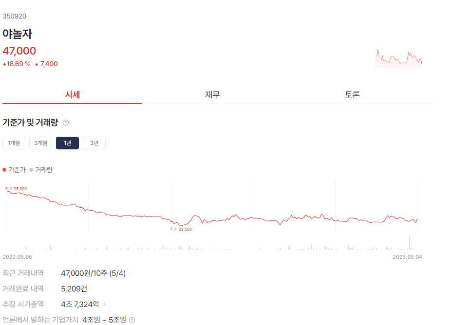 야놀자는 증권플러스 비상장에 현재 47000원으로 거래되고 있습니다.