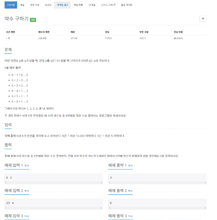 백준 2501번 약수구하기 간단한 문제이다.