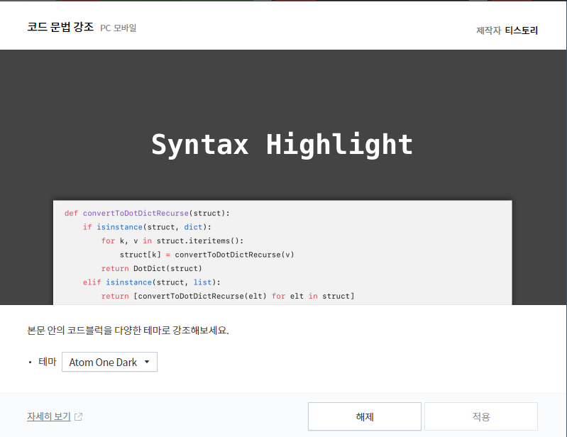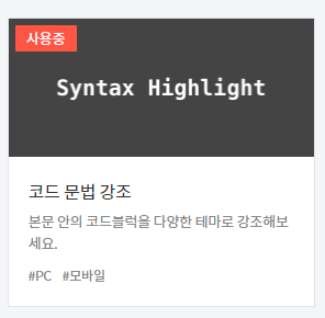많은 플러그인 중에 syntax highlight 코드문법강조를 선택 합니다.