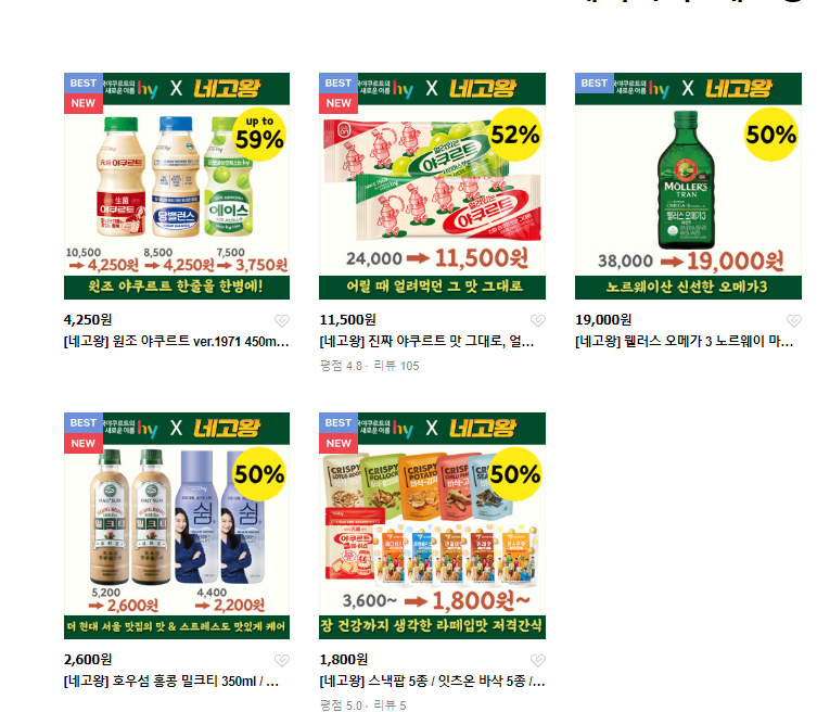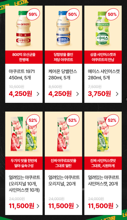 최대 59%까지 보입니다. 야쿠르트 450ml 5개 4250원/ 케어온 당밸런스 280ml,5개 4250원